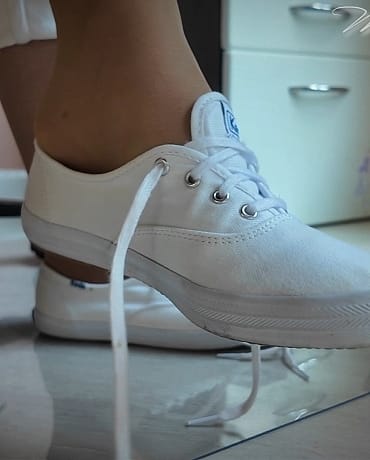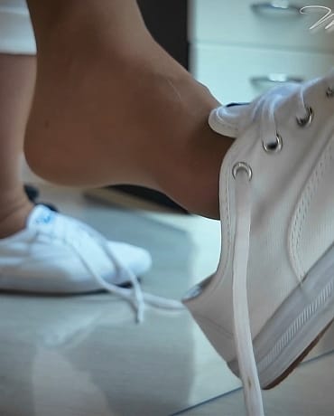 A slow bobbing of the foot causes the heel of the shoe to slide off and reveal more and more of my nylon clad foot. I begin dangling the entire shoe, faster and faster, as it floats to the tip of my toes before it drops and I repeat the same action with the other sneaker.