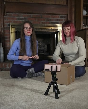 AJ and Madalynn are in their tight jeans and turtleneck sweaters unboxing a present on their livestream. The ladies are on the floor enjoying the chatrooms interaction and support. AJ opens the box as Madalynn reads the note out loud, and Madalynn quickly has to slow a very excited AJ down as they both have no idea what this streaming prototype is, what it does and there are no directions.