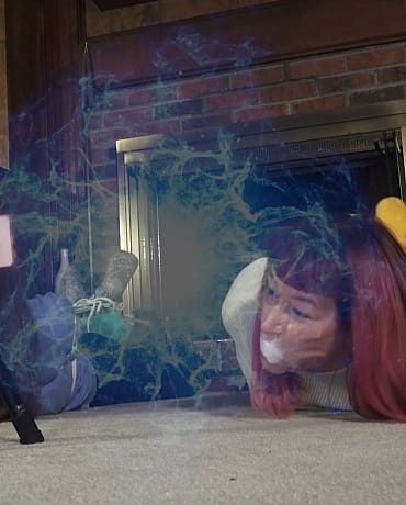 When Madalynn isn’t looking AJ just starts pressing buttons and next thing the chat sees is a bright ball of light and AJ is tied up on the floor!
