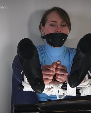 Madalynn is tied to a chair on its side in a tight turtleneck top and even tighter jeans. She’s sat on the hardwood floor with her leather ballet slipper feet on full display. Her wrists are tied between her ankles and she’s been gagged with a black leather panel gag.