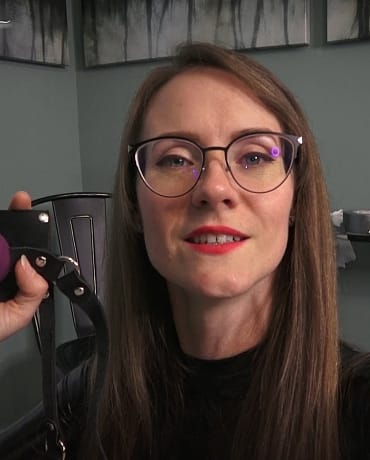 Madalynn heads back to her chair and gets the next items together, because she doesn’t trust you anymore. She pulls out her handcuffs, and explains how she’s going to use them on you. She shows you the leather armbinder, that she’s going to stuff your arms into so your really restricted.