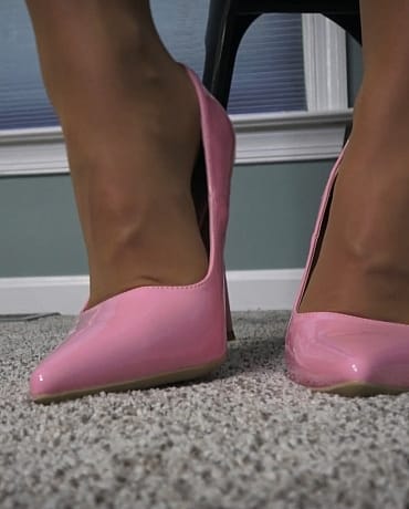 Those pretty pink heels and those long tan legs covered in shiny nylons have you at attention; FULL ATTENTION.