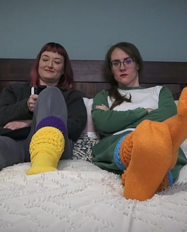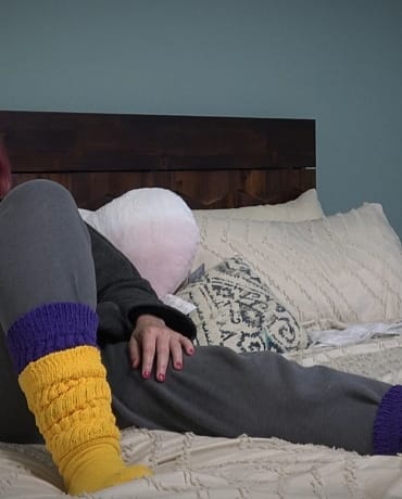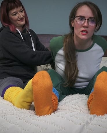 Cozy comfy ladies! AJ Marion is in her sweats, hoodie and slouch socks waiting for Madalynn who is in her sweats, sweater and double layer of slouch socks to come and watch the movie!