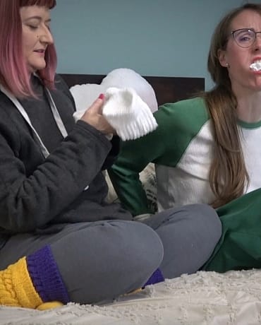 And after all of that, AJ is DONE! She starts tying Madalynn’s wrists behind her back! Then stuffs some white cloth in her mouth and seals it in with a dirty long slouch sock as a cleavegag! Madalynn is fuming by now and eventually AJ ties her up in more rope.