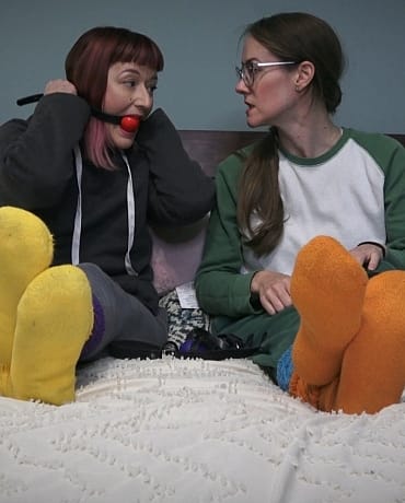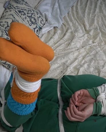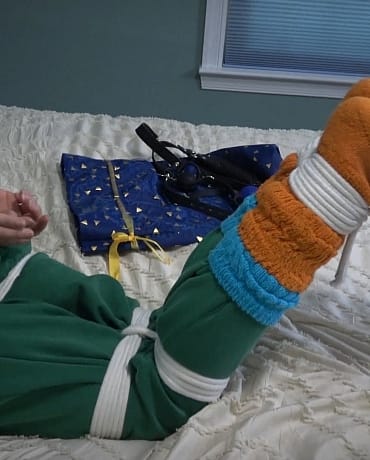 Still not satisfied and worried the cleavegag will slip, Ms. Marion slides a pantyhose hood over Madalynn’s face and leaves her to struggle on the bed all bound and gagged while she goes to get some popcorn to finish the movie!