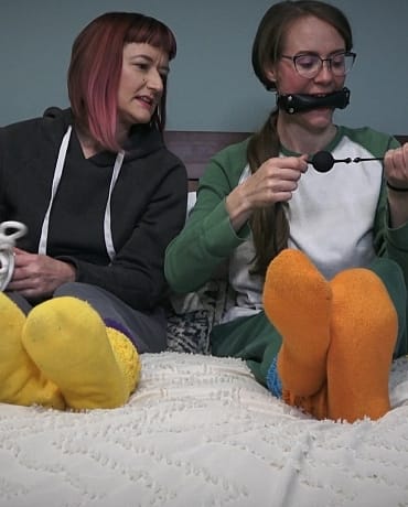 Soon, Madday is tampering with the bag and has to be explained what’s inside; GAGS! AJ shows her how to use them and she begins trying them on. First an O-ring gag that she plays with, then a blue ball gag she buckles the strap to, a leather bitgag she gets stuck in her hair, a small black ball gag.