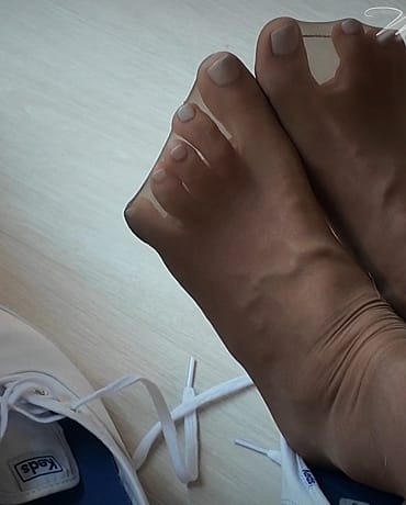 A slow bobbing of the foot causes the heel of the shoe to slide off and reveal more and more of my nylon clad foot. I begin dangling the entire shoe, faster and faster, as it floats to the tip of my toes before it drops and I repeat the same action with the other sneaker.