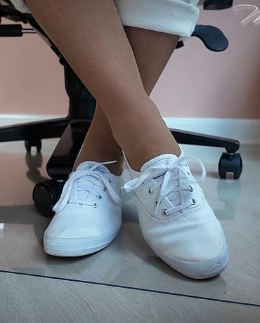 Come under my desk, and lets see what today’s office foot wear is; We have cropped jeans with exposed pantyhose clad ankles, with white canvas KEDS right in your face.