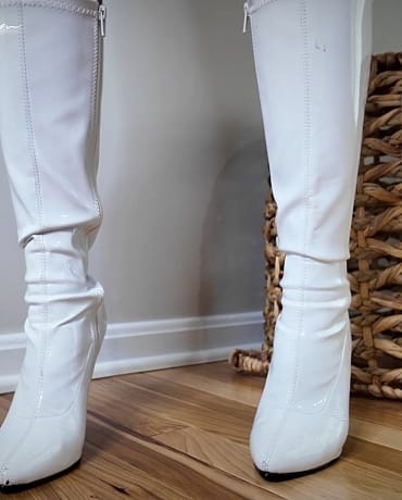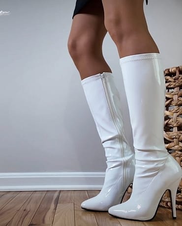 She gives you an opportunity to make it right, by worshipping her white patent knee high footwear under the condition that you get NOTHING in return. You are all about these white boots on her.