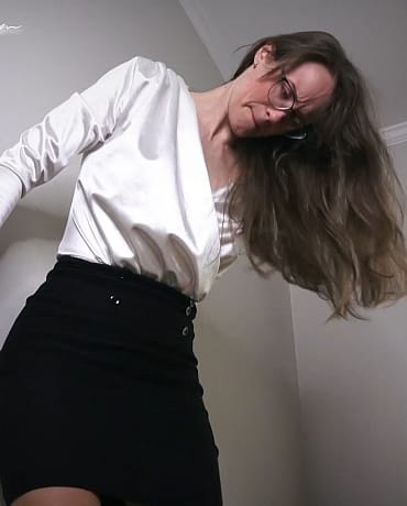 Why is she here?! You think to yourself, and you start to lose it as you see the white boots that get you flustered. Her tan, shiny pantyhose covered legs. She’s on to you. She knows you’ve been reporting back to your old agency and she’s playing with you now.