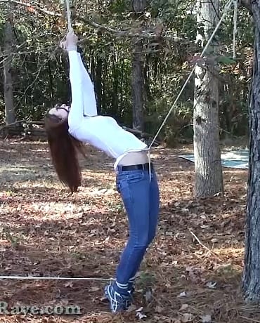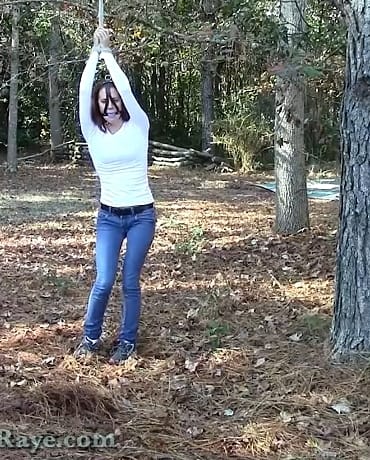 Wrangled and roped outdoors, Madalynn is gagged and strung up nice and tight, dancing on her tiptoes while the crotchrope digs into her!