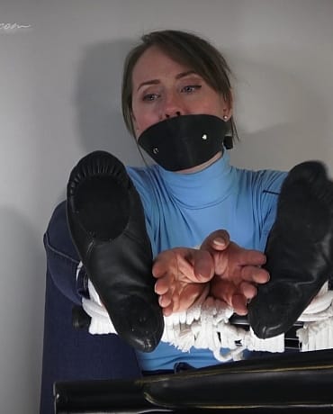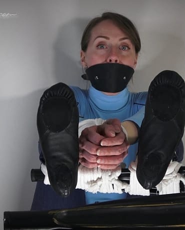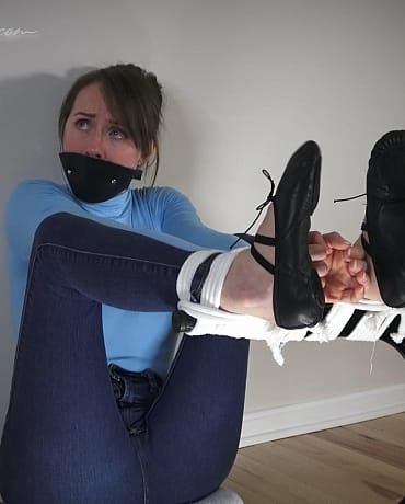 Madalynn is tied to a chair on its side in a tight turtleneck top and even tighter jeans. She’s sat on the hardwood floor with her leather ballet slipper feet on full display. Her wrists are tied between her ankles and she’s been gagged with a black leather panel gag.