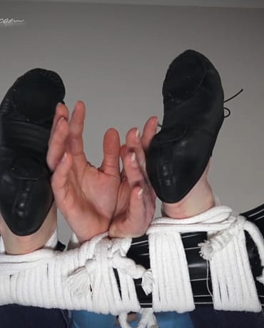 She rubs her ballet slippers intermittently with her fingers and flexes the leather for your entertainment. Madalynn is bound uncomfortably making little “Mmmppphh” and groaning sounds while you enjoy her bound in this predicament.