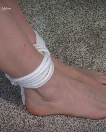 When we return, she’s tied in the same room but is in a black bra and matching black underwear… peculiar! This time she has wrist, knee, and ankle rope and is gagged with a thick, tight blue bandana. She’s mad and trying her hardest to get free. She can almost flick the tails of her ankle rope with her finger tips but the position is brutal and she can’t seem to get back to it. After a bit, Madalynn ends up loosening the wrist ropes and once her hands are free she remains calm, untying the rest of herself, pulling the cleave gag down around her neck and exiting the room, hoping the assailant is long gone.