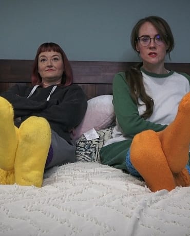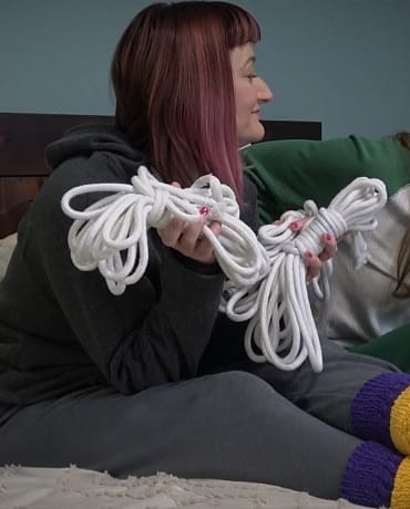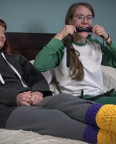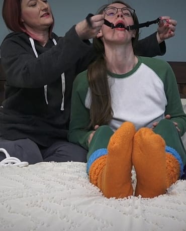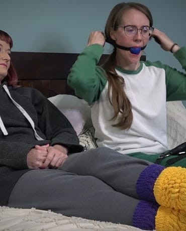 Cozy comfy ladies! AJ Marion is in her sweats, hoodie and slouch socks waiting for Madalynn who is in her sweats, sweater and double layer of slouch socks to come and watch the movie! Madalynn is terrible at watching movies and sitting still so she starts asking questions, which peeves AJ immensely. The tension begins to rise, and the body language becomes stiff as the ladies proceed into their slumber party. AJ brings out a bag and sets in next to Madalynn knowing curiosity will get the best of her. Soon, Madday is tampering with the bag and has to be explained what’s inside; GAGS! AJ shows her how to use them and she begins trying them on. First an O-ring gag that she plays with, then a blue ball gag she buckles the strap to, a leather bitgag she gets stuck in her hair, a small black ball gag. And after all of that, AJ is DONE! She starts tying Madalynn’s wrists behind her back! Then stuffs some white cloth in her mouth and seals it in with a dirty long slouch sock as a cleavegag! Madalynn is fuming by now and eventually AJ ties her up in more rope. Still not satisfied and worried the cleavegag will slip, Ms. Marion slides a pantyhose hood over Madalynn’s face and leaves her to struggle on the bed all bound and gagged while she goes to get some popcorn to finish the movie!