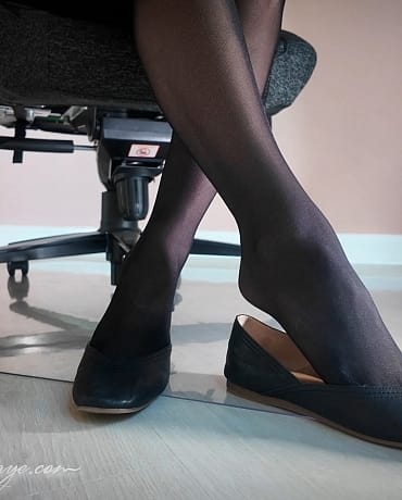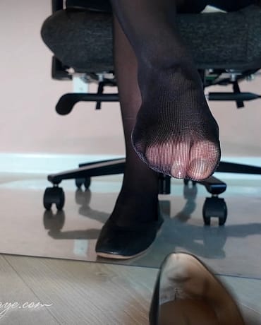 Walking into the office with my black leather ballet flats, and my black showing off my black 20 denier Venerziana Daphne tights I come to my chair, sit down, and scoot in to give you a shoe dangling show. You love the way the fabric of my pantyhose stretches over my silky smooth feet. The woven pattern is so eye catching as I flexing my feet outside of the shoe and rub my nylon covered feet together. After a little while of playing with my shoes and airing out my sexy feet, I slide my flats back on and stroll out of the office.
