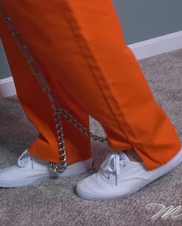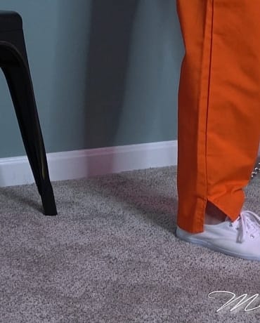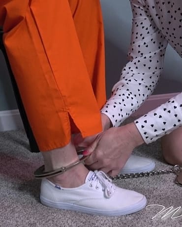 Taken into custody, Madalynn is given the proper wardrobe for her stay at the new facility she’s being booked into. She strips out of her street clothes and puts on the orange jumpsuit and white shoes she’s been assigned. After a short wait she’s cuffed at the wrists and ankles and is made to wait again for the next step in the process and for transport. Madalynn shuffles around the room in her hard steel, and messes around with it a little big before the booking counselor appears with a lock box and transport waist chain. She secures Madalynn in her confines and gives her some optimistic words that they’ll be moving her soon. Madalynn continues to wait, not knowing how long this will take and fidgeting a bit in her cold steel binds.