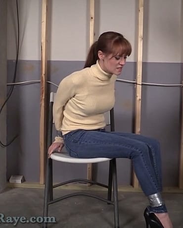 A man takes Madalynn into a basement room. He tells her that she is staying with him and that she better not cause him any problems. But Madelynn is in no mood to be cooperative and she tries to escape. So the man grabs her and tapes her up good and tight. Again she tries to escape, so the man uses more tape until he has her bound helpless. Then because she will not shut up, he stuffs and tapes a pair of panties in her mouth to gag her. But now the man is not so eager to be nice to Madalynn and things are going to get pretty nasty for her when he uses scissors to start cutting her clothing off. Lucky for her, he stops at her bra and panties. He has to give her some kind of reason to consider cooperating. But he warns her, "Anymore problems, the bra and panties are next. And you know what that means!" After leaving Madalynn to struggle bound and gagged for a while, it is time to take her with him again. So he returns to her, lifts her off the cold basement floor and carries her away bucking and kicking over his shoulder.
