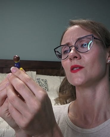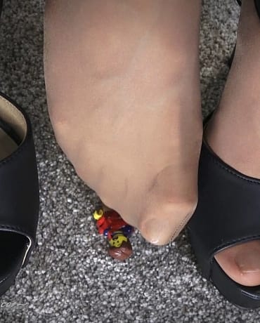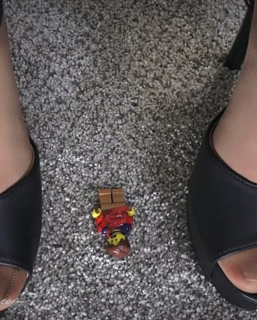 Madalynn is on the phone with her friend when she walks into her apartment, she gets the news that there’s a man that’s been shrunk and he’s some how escaped his confines. As Madalynn takes a seat on her bed she notices that her clothes pile is moving and gets off the phone immediately. She goes to investigate, and as she moves each garment she’s surprised when she finds it’s a tiny human in her clothes pile. She lunges to catch them, and she’s fascinated by her find. That her tiny ward looks VERY familiar. That it is indeed the guy from the news on TV! How did he teleport into her bedroom?! But that’s not important right now, Madalynn is feeling frisky. She has her very own tiny! Something she’s always dreamed of… She picks him up and takes him over to the bed and promises that she only wants to have a little bit of fun. She holds him by her long pantyhose covered legs and guides him down by her huge high heeled feet. Giving this tiny a tour of her assets. Madalynn grabs a very thin roll of tape and binds the little shrimps arms so he can’t make a fast get away. Once she’s done binding him, she brings him up to her mouth and shows her teeth as she uses them to sever the tape. Madalynn whispers in his ear and then lays him on the floor in between her high heels. She unbuckles one of them and frees a pantyhose foot, and teases it overtop of the little man. Delicately applying pressure, and being sure not to harm him. She wiggles her nylon covered feet all over his body, striking both fear and pleasure into his tiny frame. She unbuckles the other leather T strap heel and puts him under that foot. Then both feet at the same time. After some tender sole play, Madalynn decides it’s time to relax and ends up taping the tiny to the bottom of her pantyhose feet while she has both feet propped up on the bed and tries to figure out what to order for dinner.
