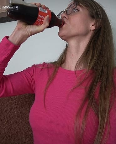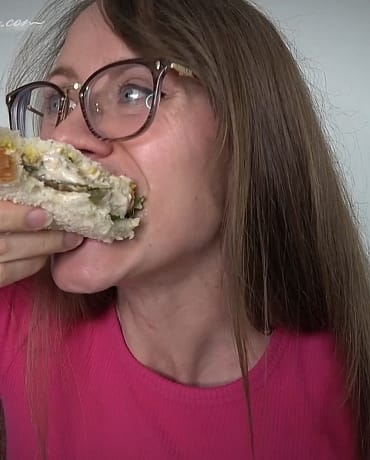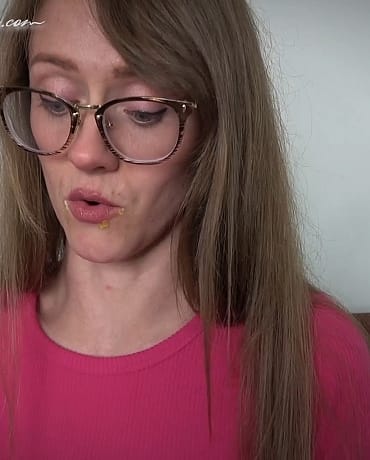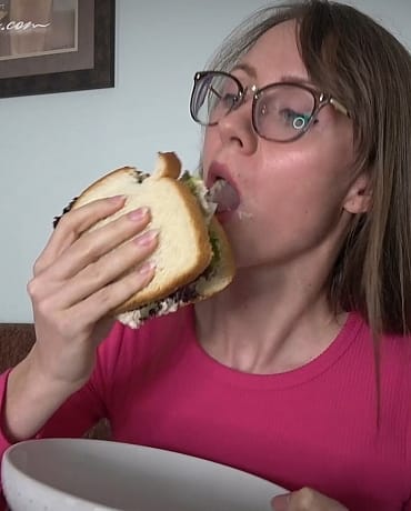 After a day of filming, it’s time for Madalynn to take a lunch break with a homemade tuna salad sandwich and a couple of drinks. She’s wearing a tight pink sweater top, and size zero high waisted pants with pantyhose underneath.